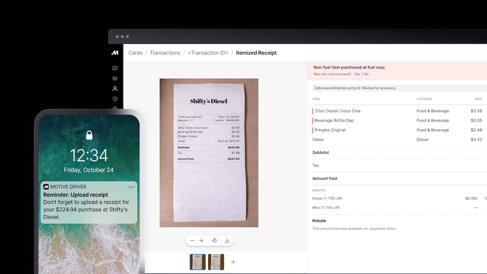 Fleet managers shouldn’t have to choose between manual audits and financial uncertainty. That’s why Motive is introducing AI-powered receipt reading to automatically flag non-compliant spend. This new AI receipt reading feature uses Motive Card transaction data and AI to scan receipts and classify each line item, so fleet managers get item-level visibility into every transaction.