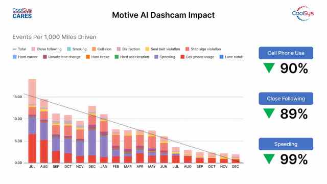 “All behaviors have had a dramatic improvement in terms of our driving behavior,” Martinez says. CoolSys focused specifically on reducing cell phone use, speeding, and close following. “Every one of those was reduced by at least 90% across our fleet,” he says.