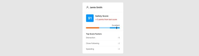Every week, drivers received a safety score based on real-time dash cam and Vehicle Gateway data. The Motive Safety Score evaluates driver performance over time for an accurate measure of driver risk across 15+ unsafe driving and positive behaviors. Scores were published across the company, creating transparency and a bit of friendly competition. Drivers understood how their score was calculated and the actions that could improve it.