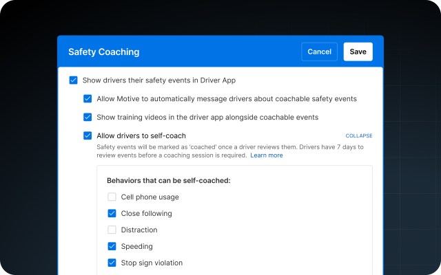 Easily customize your program to focus on the behaviors that matter most. Use in-cab alerts to coach drivers in real time, and only escalate issues to the Motive Dashboard for review if the unsafe behavior persists. Drivers can correct issues immediately, while you stay focused on the drivers and behaviors that require the most attention.
