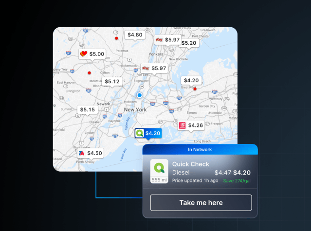 To assist drivers in locating the best fuel prices and savings, we developed our Savings Finder tool, available in the Motive Driver App. This convenient tool displays nearby partner locations, along with fuel prices and Motive Card discounts, making it simple for drivers to plan their stops and navigate to the best savings.