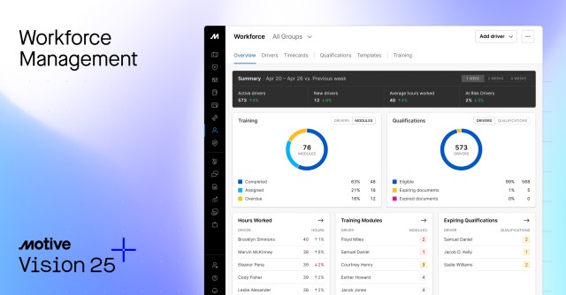 With Motive Workforce Management, all these processes now live in one place – inside the same platform customers already use to manage their drivers, vehicles, and equipment. Built on the Motive Integrated Operations Platform, the system is connected by design, powered by AI to automate repetitive tasks, flag risks, and free up teams to focus on what matters most.