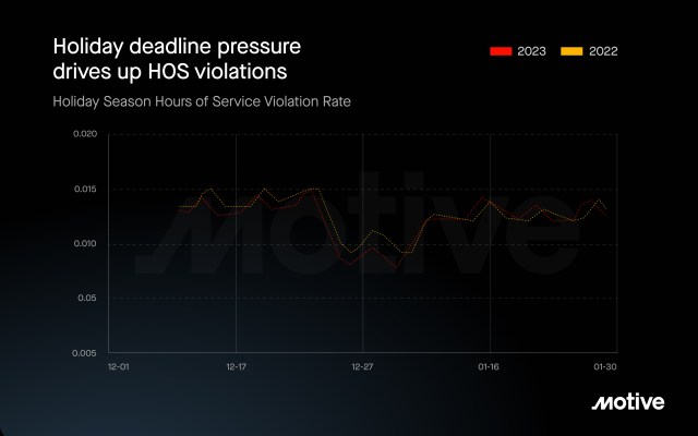 Motive data also shows that nearly half (47%) of all collisions occur after dark, even though more vehicles are on the road during the day. Hours-of-service violations peak during the holidays as well, as drivers push themselves to meet demand. After the holiday rush, these violations tend to drop, reflecting the season’s intensity.