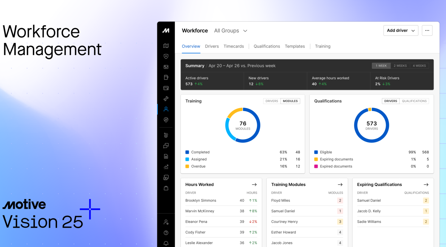 At this year’s Vision 25: The Motive Innovation Summit, we showcased our new integrated Workforce Management solution, designed to directly address one of the most significant challenges facing fleets today — effectively managing their people.