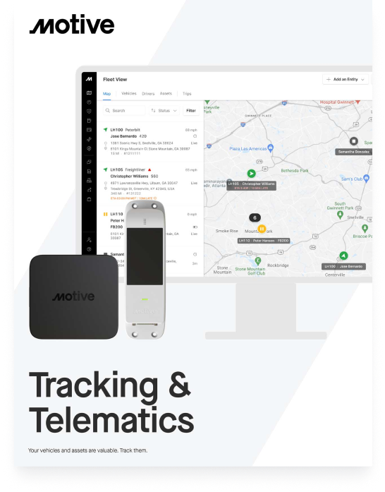 Track and monitor fleet vehicles, drivers, and assets. Access real-time and historical data. Analyze utilization, vehicle health, dispatch, temperature logs, and dormancy reports. Get dynamic ETAs and automatic alerts from geofencing, idling, motion, and more.