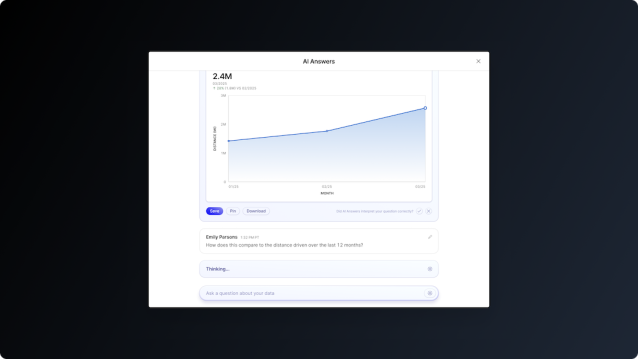 AI answers empowers teams to turn data into action instantly. It interprets everyday questions asked in plain English and delivers insights in seconds. Instead of waiting on business analysts, managers gain real-time visibility into performance, trends, and opportunities. With AI answers, fleets make faster, more confident, data-backed decisions by simply starting a conversation.