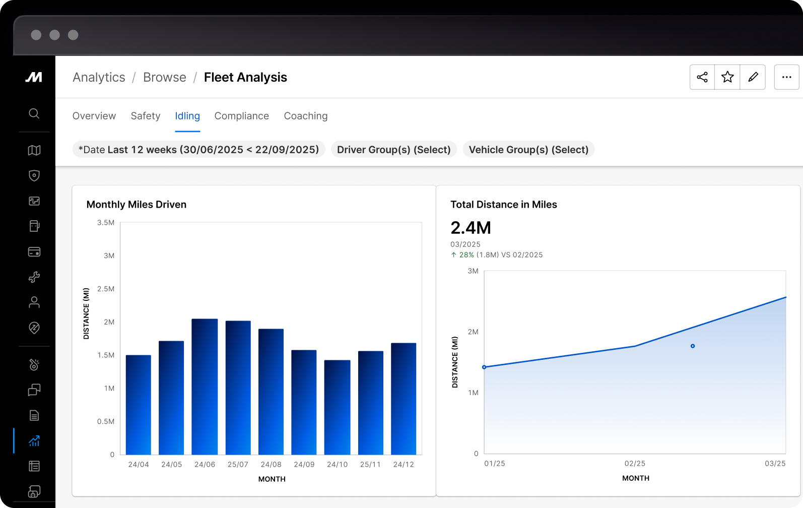 Motive Analytics reduces manual work by centralising data for automated fleet reports, no more spreadsheets or tedious analysis. Smart filters and instant insights save time and pinpoint where to focus, revealing trends and opportunities that boost profitability and productivity.