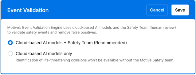 If a customer does not want their safety events validated by the Motive Safety Team, they can choose to validate events with cloud-based AI models only and forgo human review. Identification of life-threatening collisions is not available without the Motive Safety Team.