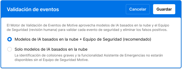 Si un cliente no desea que sus eventos de seguridad sean validados por el equipo de seguridad de Motive, puede optar por validar los eventos únicamente con modelos de IA en la nube y prescindir de la revisión humana. La identificación de colisiones que ponen en peligro la vida y la función de Asistente de Emergencias no están disponibles sin el equipo de seguridad de Motive.
