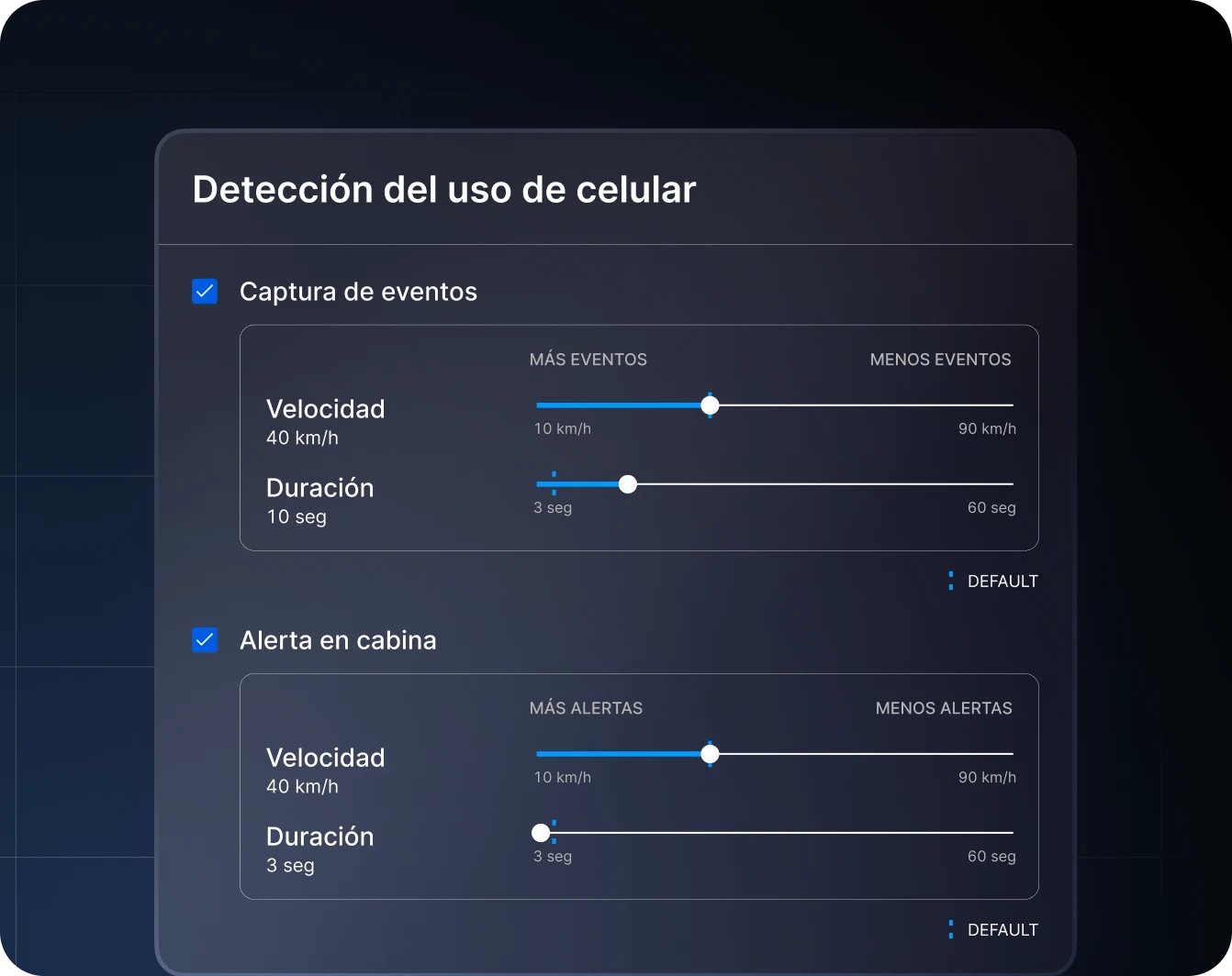 En el Motive Dashboard, selecciona el comportamiento para el que deseas establecer un umbral y ajusta el control deslizante. Tomemos como ejemplo el uso del celular. Puedes establecer umbrales de velocidad y duración tanto para la captura de video de eventos como para el envío de alertas en la cabina al conductor.