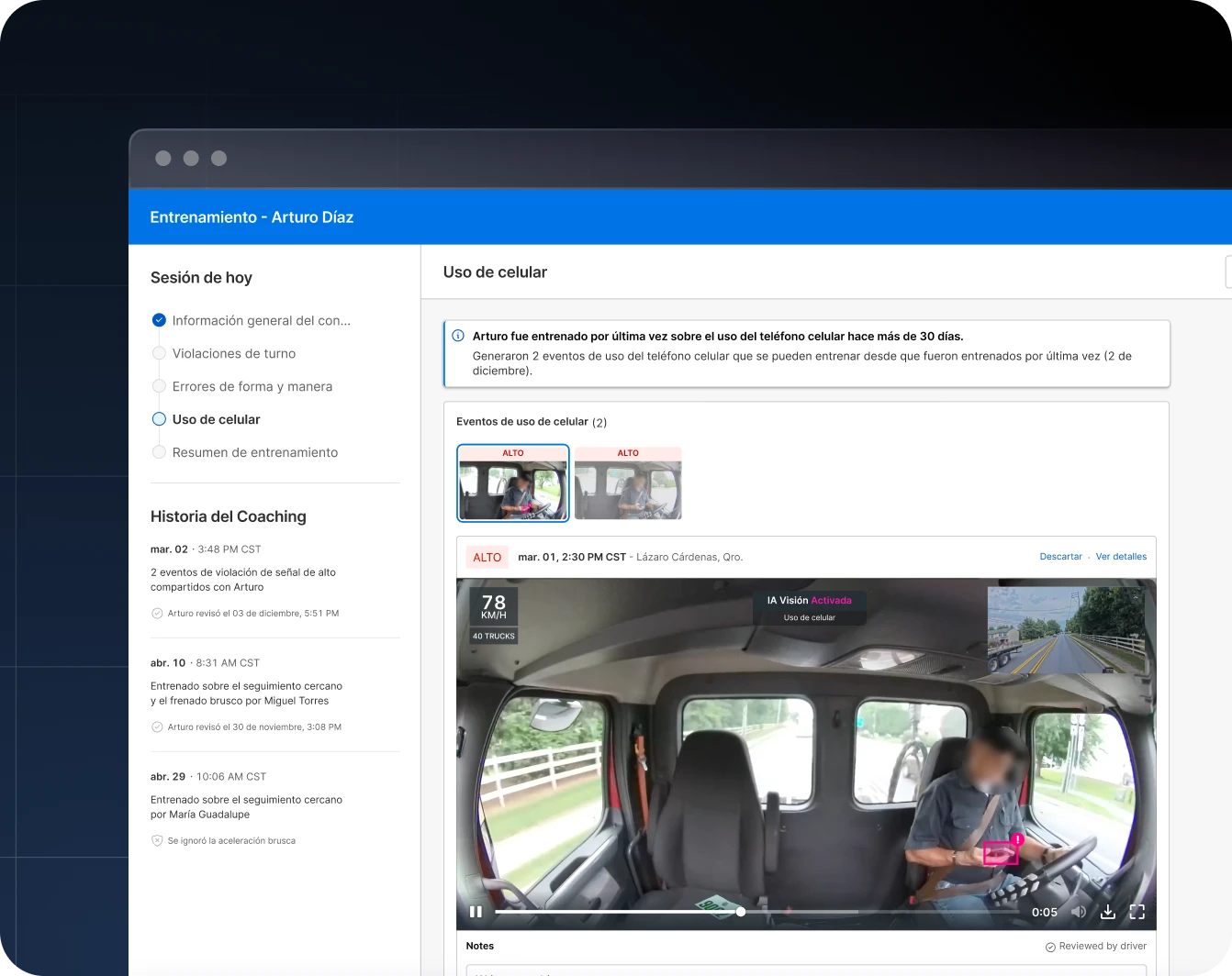 Además de ofrecer grabaciones de video nítidas, Motive proporciona retroalimentación personalizada y oportuna a los conductores sobre comportamientos peligrosos críticos. También permitimos que los gerentes de seguridad mantengan un registro de las actividades de coaching. Nuestro equipo de seguridad revisa los eventos para que los gerentes de seguridad puedan priorizar a los conductores que necesitan coaching.