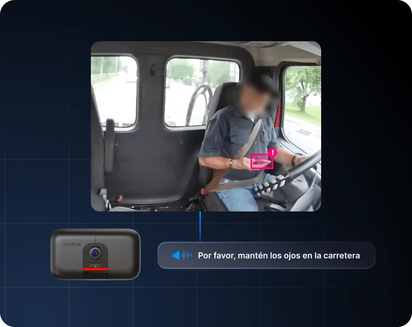 Con la IA Dashcam de Motive, los conductores pueden recibir alertas mientras conducen para corregir problemas de inmediato. Con una precisión de hasta el 99%, la IA Dashcam para flotas de Motive detecta más de 15 comportamientos de conducción peligrosos, como el uso del celular, la somnolencia y el seguimiento cercano. Al detectar un comportamiento peligroso, el conductor recibe una alerta sonora o visual a través de la cámara.