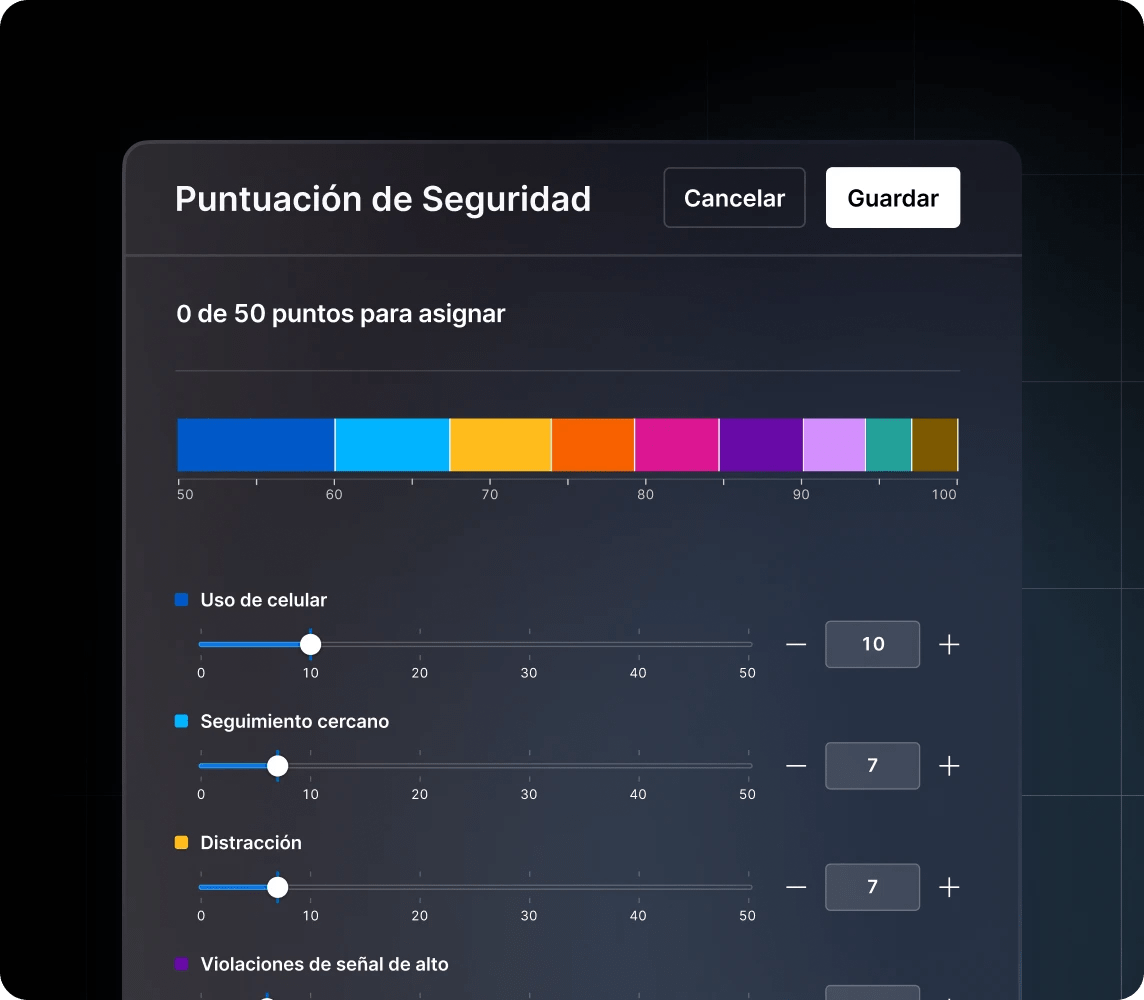Realice un monitoreo del comportamiento del conductor a lo largo del tiempo, recompensa la conducción segura y fomenta la competencia sana con un puntaje de seguridad personalizable.