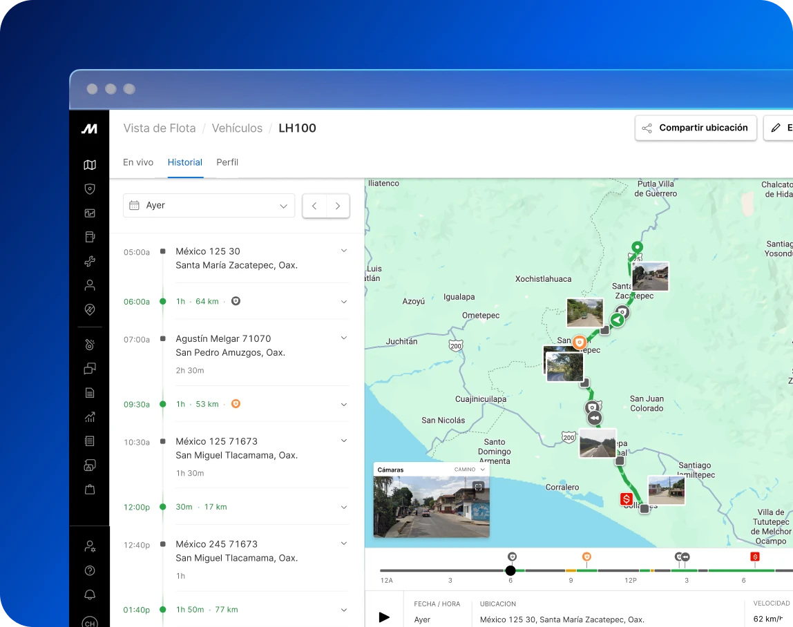 Puedes revisar el historial detallado de viajes, reproducir las rutas de los vehículos y ver todas las imágenes de la dashcam para confirmar las paradas e investigar eventos. Visualiza los niveles de combustible, RPM, velocidad y las condiciones del remolque refrigerado (si aplica) en cada momento. Esto proporciona una prueba de servicio o entrega y también ayuda a resaltar actividades sospechosas que requieran una acción correctiva.