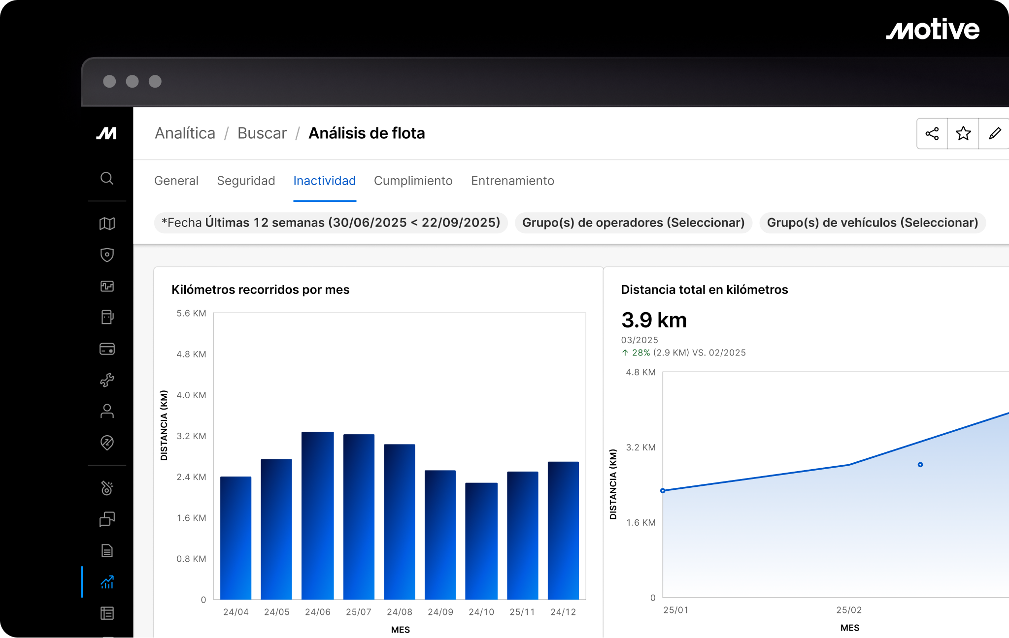 - Visualizar problemas y oportunidades de forma instantánea: Creación de paneles y reportes personalizados en tiempo real y al instante con todo el poder de la IA. Filtros inteligentes para que los equipos tengan un panorama instantáneo sobre los rendimientos y las tendencias de su flota sin necesidad de hojas de cálculo.