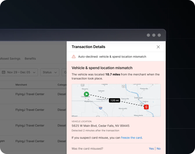 Fleets need efficient and savings-minded service providers. Motive Card flags suspicious activity and alerts fleets of potential fuel theft or fraud when the vehicle location doesn’t match the spend location.