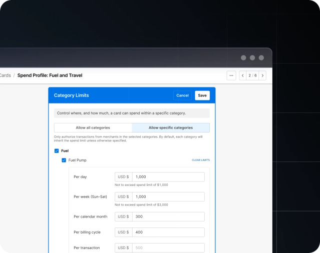 - Where the card can be used, including enabling or disabling transactions in specific categories like fuel, maintenance, supplies, food, and travel.