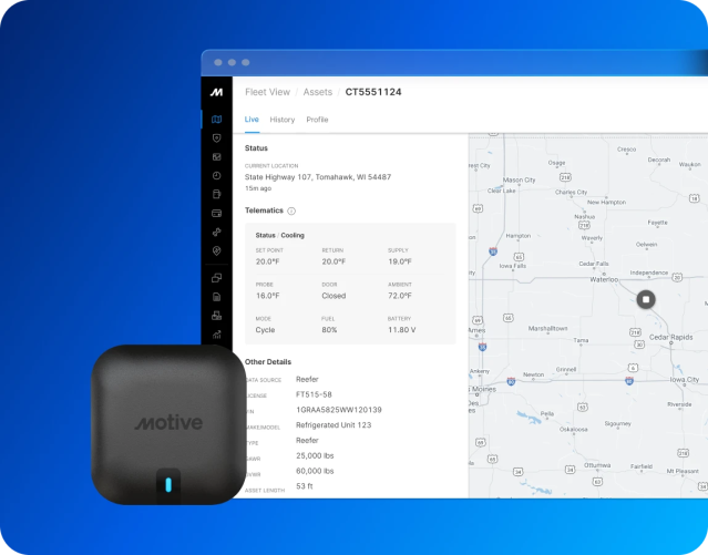 Motive’s Reefer Monitoring solution provides visibility, control and protection to fleets hauling temperature sensitive cargo. Features include temperature, humidity and door tracking, fleet and driver alerts, historic reefer logging, and remote control capabilities.