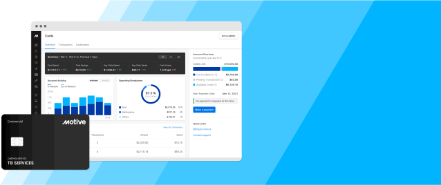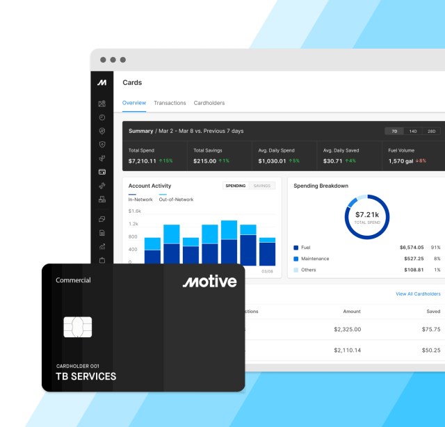 *New customers must have active Fleet Management and Motive Card within 90 days of one another. Existing Motive customers will get up to 1.5% cashback ongoing. The Motive Card Fraud Protection Guarantee is subject to the following Fraud Protection Guarantee Terms and Conditions. The Motive Card is issued by Sutton Bank, Member FDIC pursuant to a license from Mastercard International. Subject to terms of Spend Management Services Agreement. Mastercard and the circles design are registered trademarks of Mastercard International Incorporated.