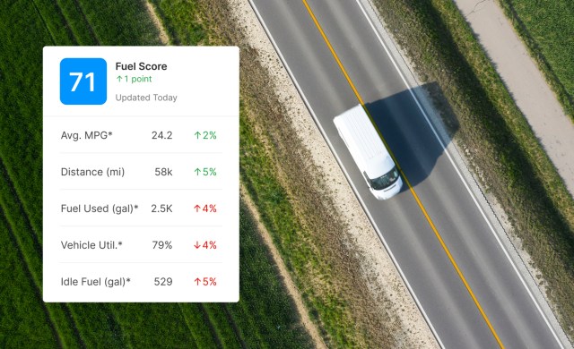 See your fleet’s objective fuel consumption and trends. View by driver, vehicle, or fleet — benchmarked across Motive’s entire network.