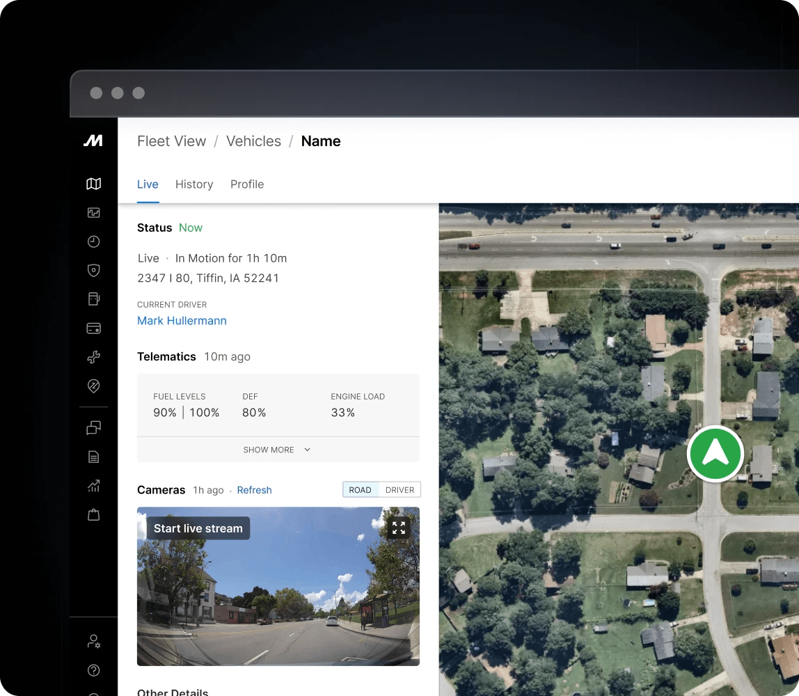 Managers can view live dash cam video footage to train drivers remotely and reward them for safe driving. This optional feature was built with driver privacy in mind. To use, it must be turned on by a fleet administrator. In-cab audio and visual alerts notify drivers when the live stream starts and ends. These alerts can’t be turned off. Only users with live streaming permissions can initiate this feature.
