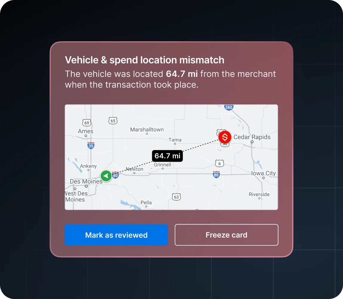 Find new ways to save by managing your fleet in the same dashboard you manage spending. Reduce fleet expenses, cut fraud losses, lower fuel costs, and get more done.